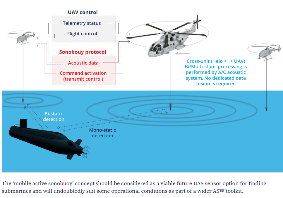 Yüksek performanslı çözüm, hafif, geri çekilebilir bir daldırma dizisi tasarlamak için önemli bir çaba gerektirecektir (harcanabilir sonoboy sensörleri yalnızca açılma özelliğine sahiptir). Yerleşik sonoboy işlemcisi aracılığıyla akustiği ele almanın yanı sıra, komuta uçağının (MPA veya ASW Helo) görev sistemi entegre bir İHA kontrol modülüne ihtiyaç duyacaktır. Bu, İHA yörüngesinin planlanması ve izlenmesi, çoklu statik operasyonlarda daldırma pozisyonları ve sensör tahsisi dahil olmak üzere arama modellerinin yürütülmesi ve diğer temel işlevler için çok önemlidir.