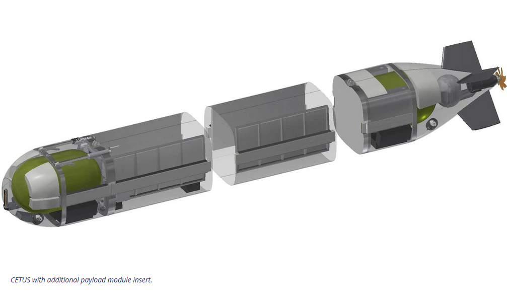 Dünya çapında geliştirilmekte olan çoğu XLUUV tasarımında olduğu gibi, standart boyuttaki CETUS versiyonu, karayolu taşımacılığı ve nakliye için yönetilebilir bir standart boyut olan 40 fitlik bir konteynere (FEU) sığacaktır. Merkez modüldeki standart Ana Yük Alanı (MPS) 2m x 2m x 2m’dir ve üst ön uçta ve alt arka uçta muhtemelen sensörler tarafından kullanılacak küçük İkincil yük alanları vardır.