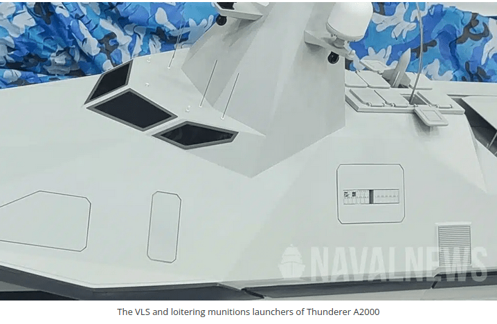 Naval News, WDS 2024 fuarındaki Çin pavilyonunda CSSC yetkilileriyle görüşerek Thunderer A2000 hakkında önemli bilgiler edindi. Kapsamlı su üstü ve hava gözetimi için bir AESA radarı ile donatılan Thunderer A2000’in ağır silahları dikkat çekiyor. 8 hücreli dikey fırlatma sistemine (VLS) sahip olan tekne, etkili hava savunma yetenekleri için kısa ve orta menzilli karadan havaya füzeleri (muhtemelen HQ-10) barındırıyor.