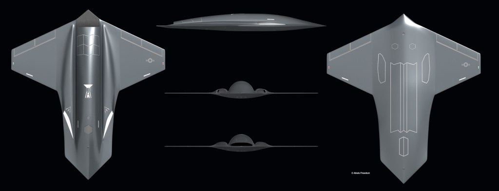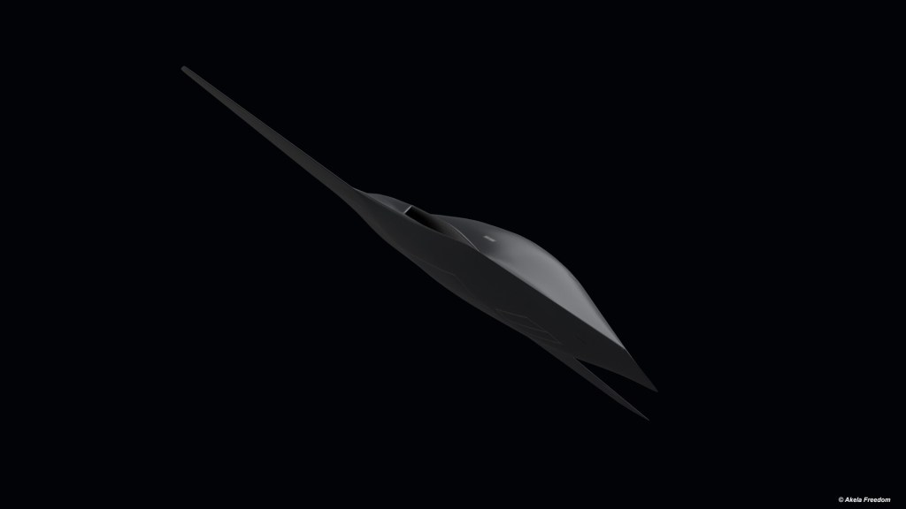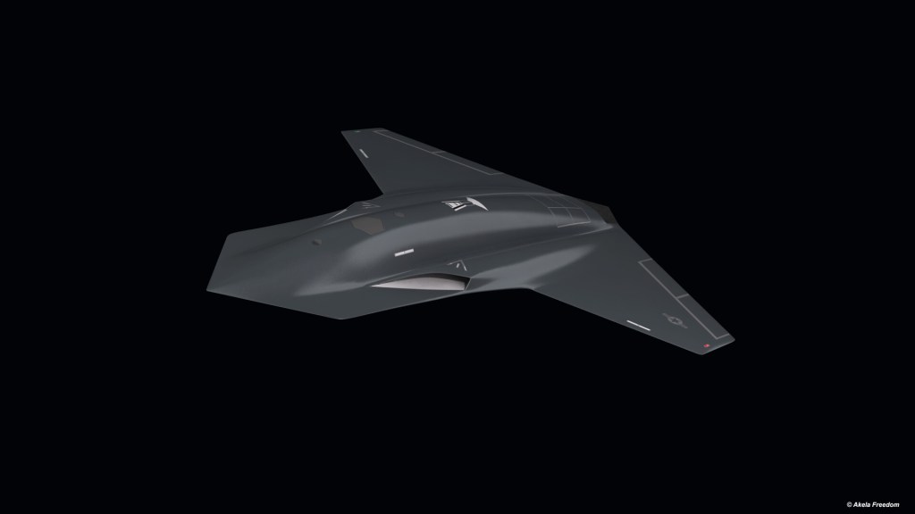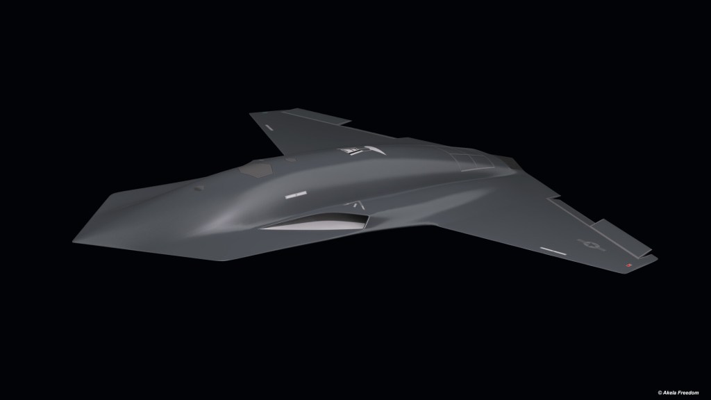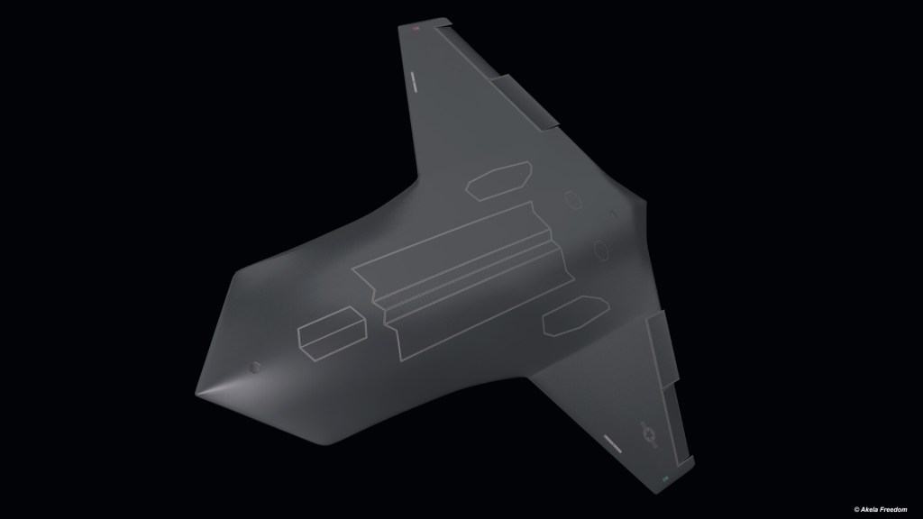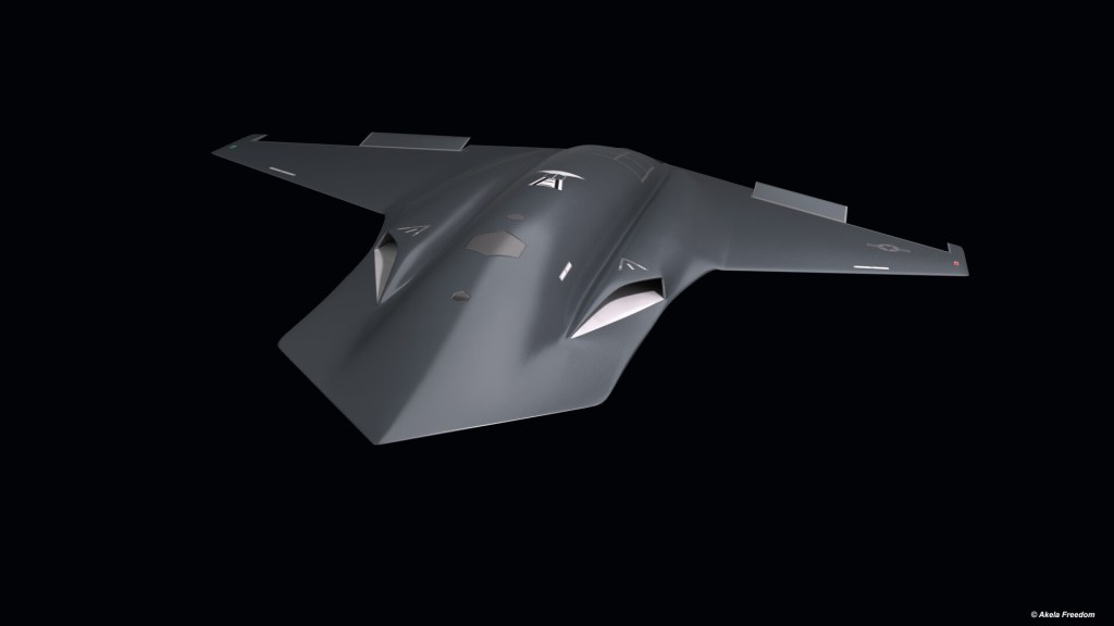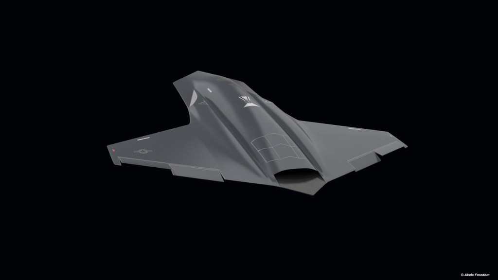 Sunuma eşlik eden bir sanatçı konsepti, Kratos’un logosu ve küçük bir ABD Hava Kuvvetleri (USAF) çıkartması ile siyaha boyanmış kuyruksuz bir İHA’yı gösteriyor.