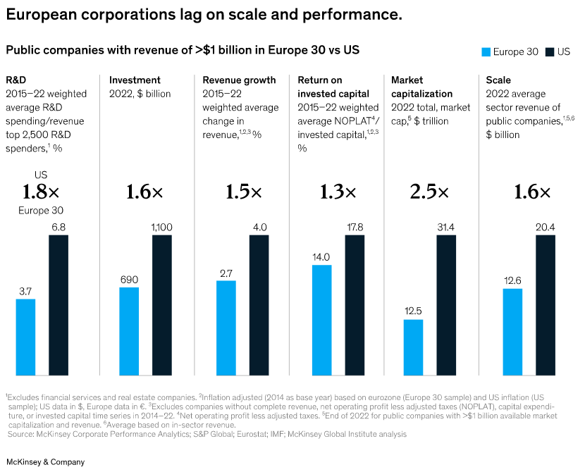 Sermaye: Artan sermaye maliyeti Avrupa’nın düşük getirilerini ve yatırım açıklarını ortaya çıkarmaktadır. Uzun yıllar boyunca faiz oranları düşük ve sermaye bol olmuştur. Bu koşullar altında, Avrupalı firmaların ABD’li şirketlere göre yaklaşık yüzde 20 daha az sermaye getirisi sağlamasının daha az dezavantajı vardı. Ancak net sıfıra geçiş ve inovasyonu desteklemek için önemli miktarda sermayeye ihtiyaç duyulduğu bir dönemde faiz oranları artmıştır. Avrupa şirketlerinin yatırım portföylerini yeniden değerlendirmeleri gerekebilir.