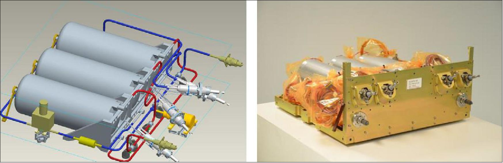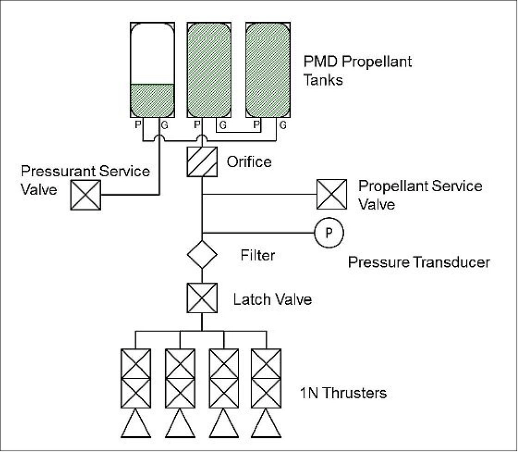 ECAPS tarafından SkySat platformu için geliştirilen komple HPGP tahrik sisteminin mimarisi Şekil 33’te gösterilmektedir. Sistem tasarımı temel olarak dört adet 1N HPGP iticisi, seri olarak bağlanmış üç itici tankı (İtici Yönetim Cihazları aracılığıyla dışarı atma), iki servis valfi, bir mandal valfi, bir basınç transdüseri ve bir sistem filtresinden oluşmaktadır. Seçilen tüm bileşenler önceki görevlerden uçuş mirasına sahiptir.
