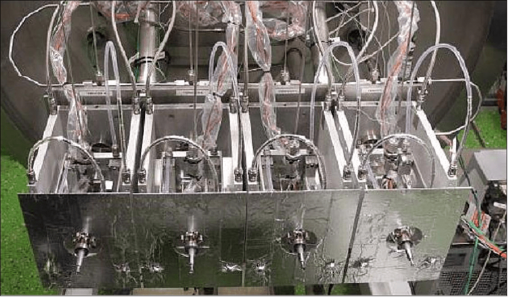 ECAPS, artan itici üretim oranlarını desteklemek için ilave vakum sert lehim istasyonlarına yatırım yapmıştır. Ayrıca, gelişmiş bir itici kabul testi zaman çizelgesi sağlamak için ECAPS’ın 2 numaralı Test Standı (TS-2) aynı anda birden fazla iticiyi destekleyecek şekilde değiştirilmiştir. Şekil 36 ve 37’de gösterilen yeni TS-2 konfigürasyonu, dört (4) adet 1N HPGP iticinin paralel olarak monte edilmesine izin vermektedir.