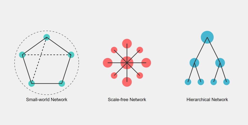 Small-world networks, first introduced by Watts and Strogatz (1998), are characterized by high clustering coefficients and short average path lengths. In human terms, this means that most nodes (individuals) in the network are not directly connected, but can be reached through a relatively small number of intermediary connections.