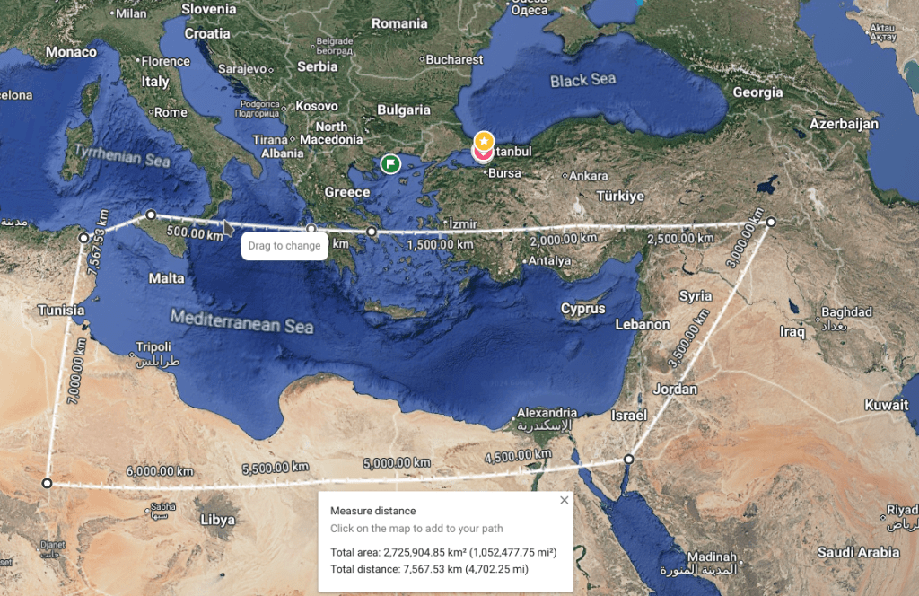 7 days 24 hours surveillance from 37.79878688816749, 12.51755764266695 , 36.52855940675389, 9.785255649267844 , 29.340515627756755, 34.8918859866266, 37.083019891819774, 42.39810985042795, 37.99225913630679, 23.708315090739053 with capability of maping 20 km x 50 km..